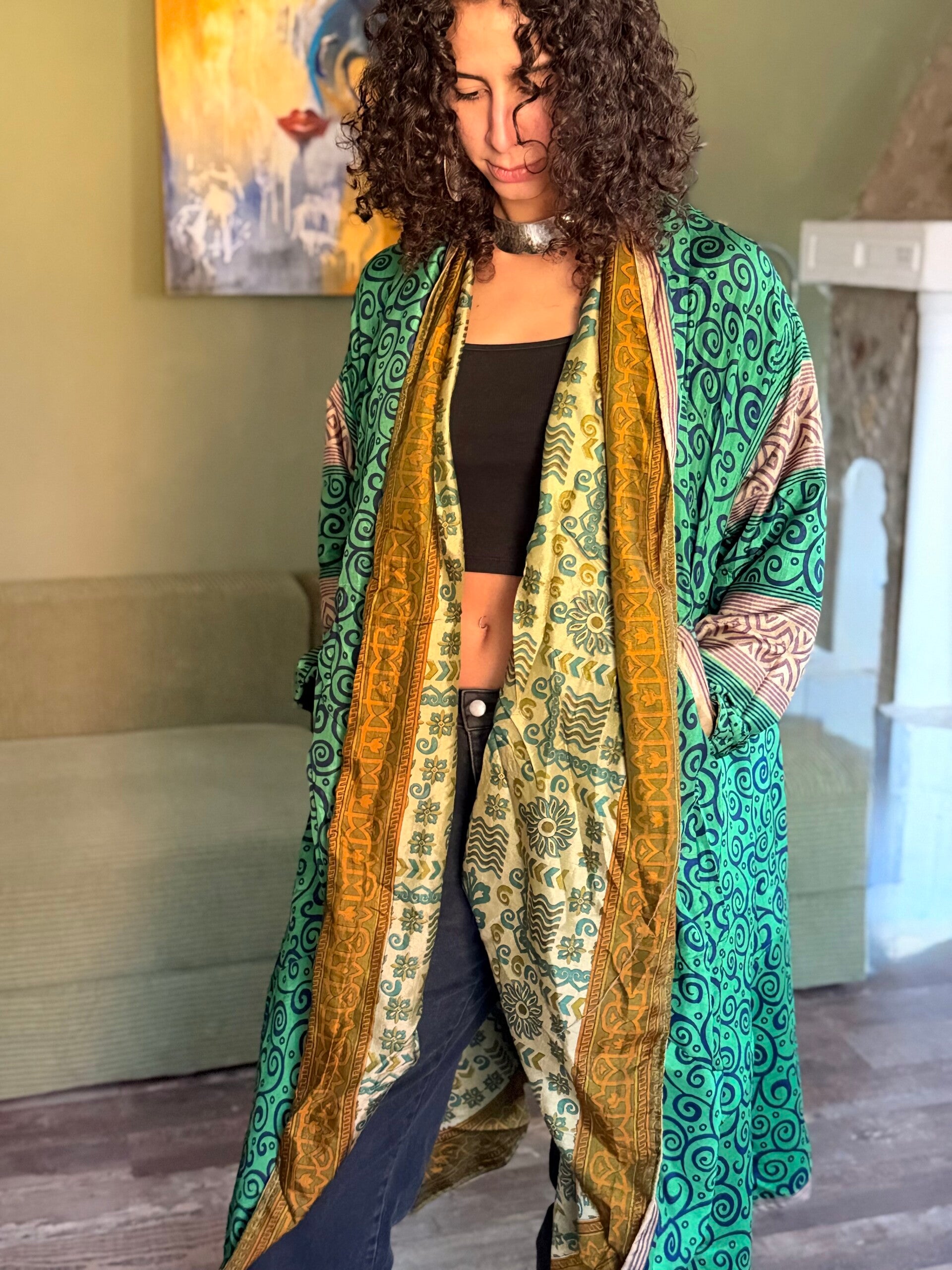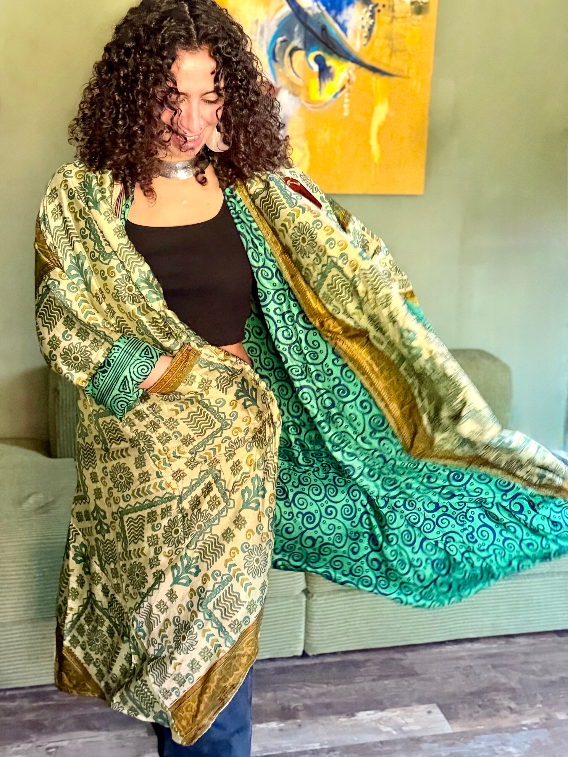 Kimono giacca in seta di sari, reversibile e con tasche, ampio e morbido, più lungo davanti
