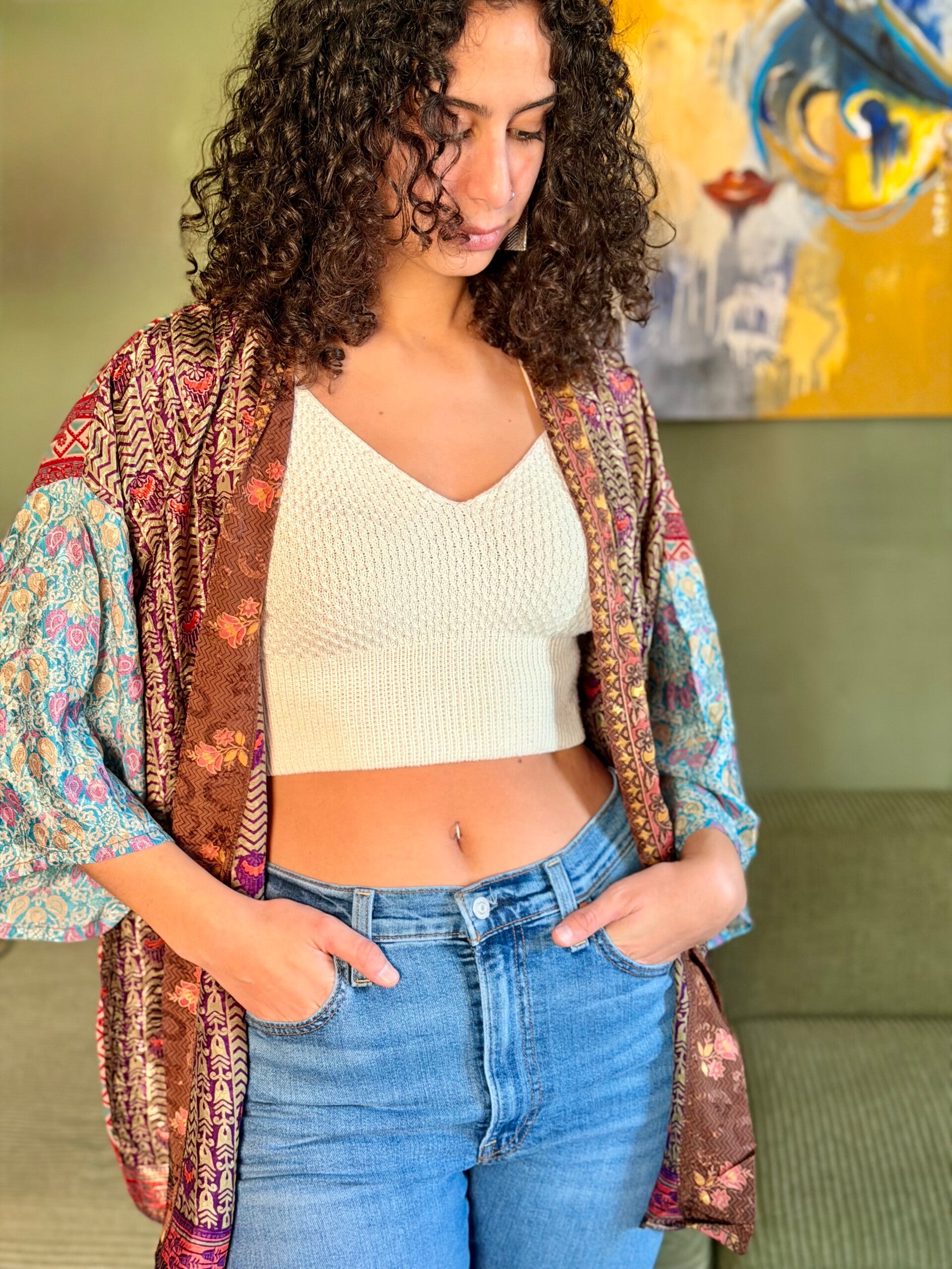 Kimono aperto in seta di Sari, tessuto molto morbido
